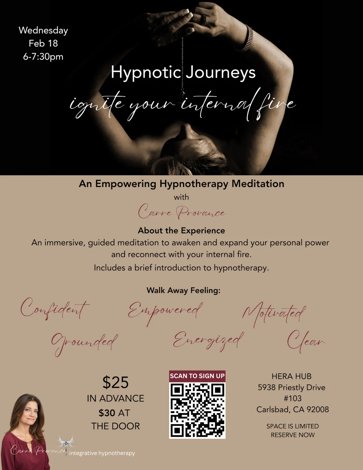 Carre Provance is a Carlsbad-based Integrative Hypnotherapist who works with individuals navigating stress, anxiety, burnout, confidence challenges, and life transitions. Her approach blends evidence-informed hypnotherapy with coaching and mind-body awareness to support lasting, meaningful change.